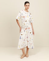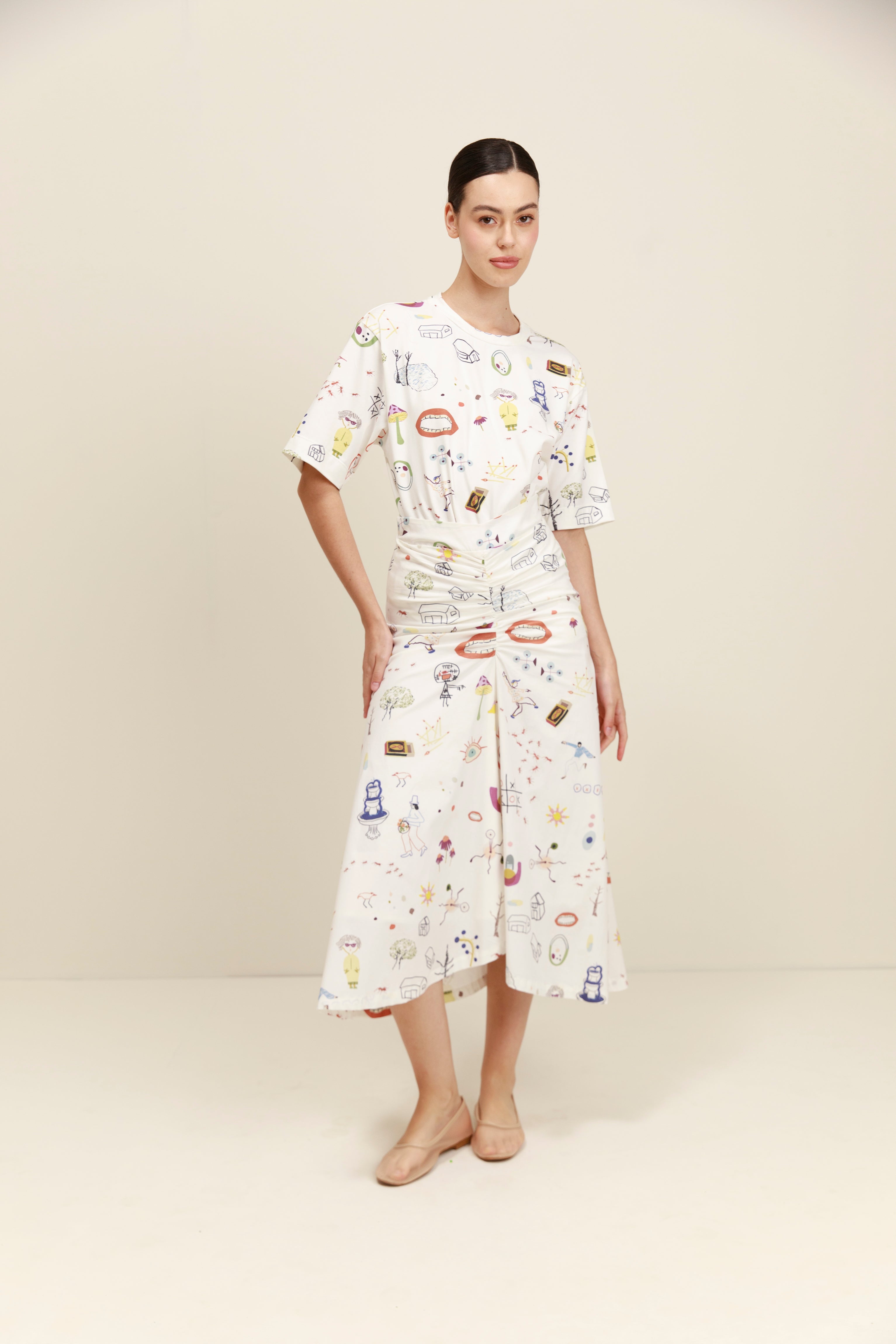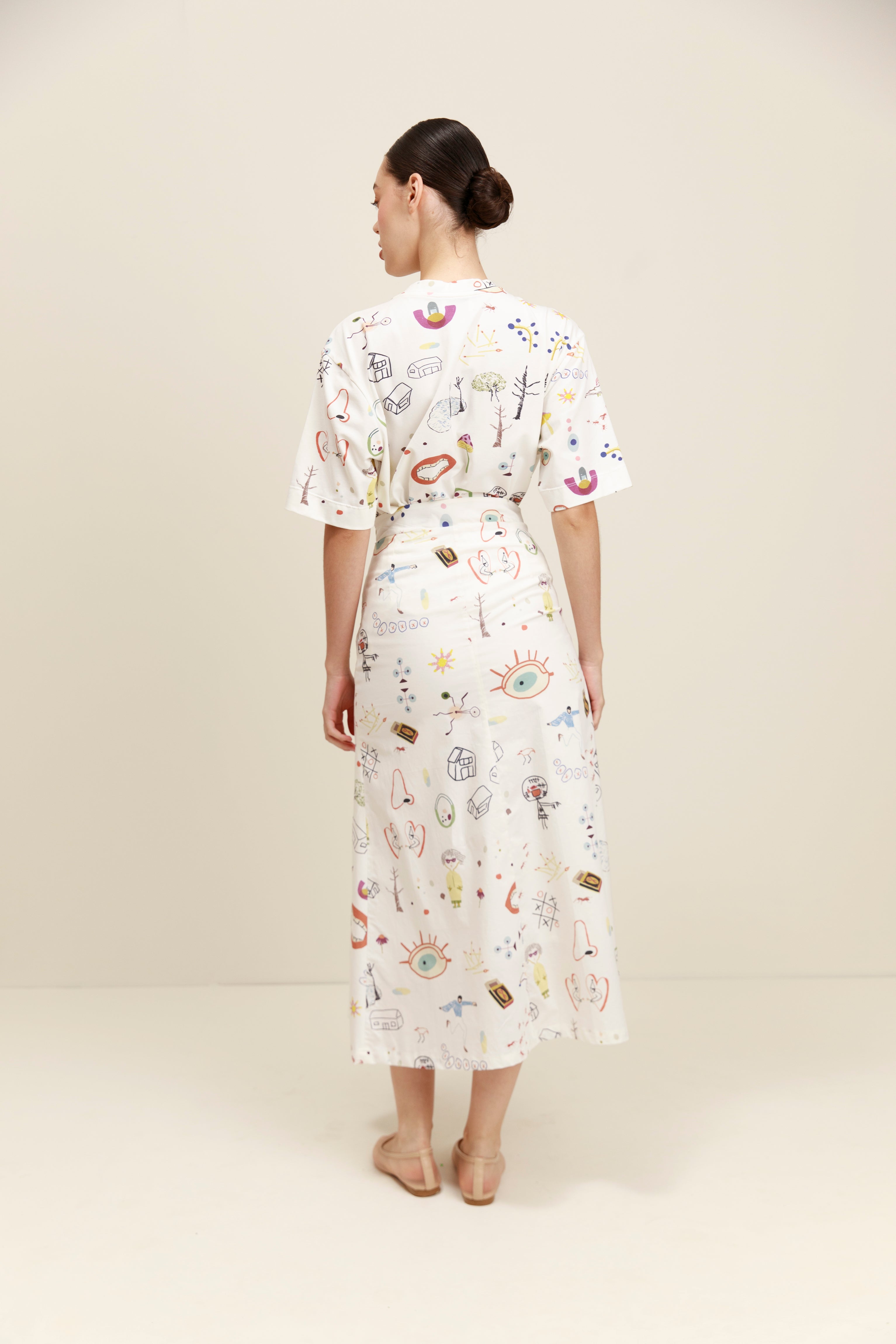 La falda Drea es sinónimo de movimiento y estilo. Con un favorecedor detalle fruncido y largo midi, está confeccionada con nuestro estampado característico, lleno de diversión e historias.