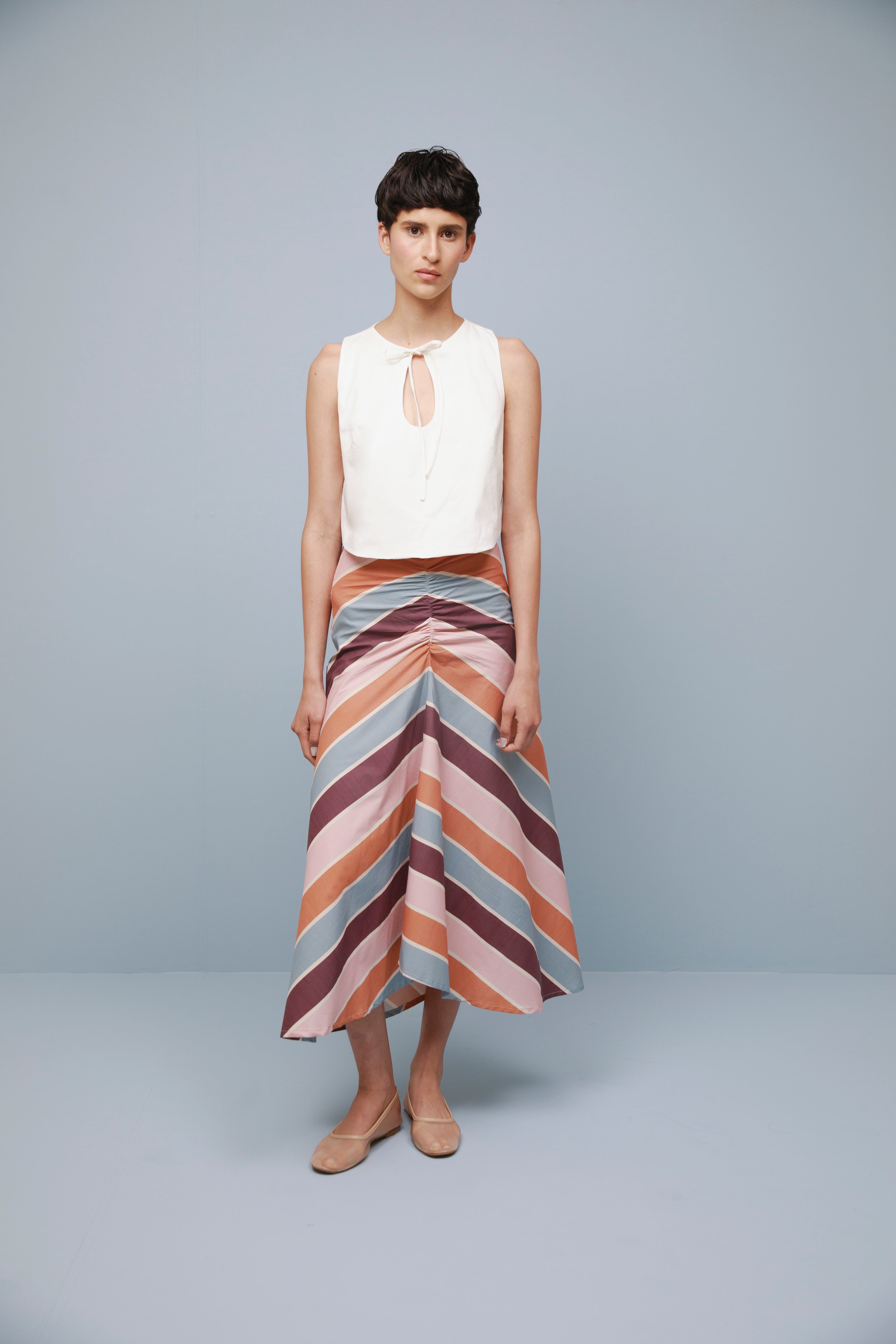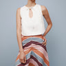 Descubre el top Eos, un ejemplo de sencillez y forma. Confeccionado en color marfil con un delicado detalle de lazo y un corte elegante, encarna la sofisticación discreta con un toque de encanto. Combínalo con la falda Opal para lograr un look armonioso, o llévalo con tus prendas favoritas de diario para conseguir un estilo atemporal y desenfadado.
